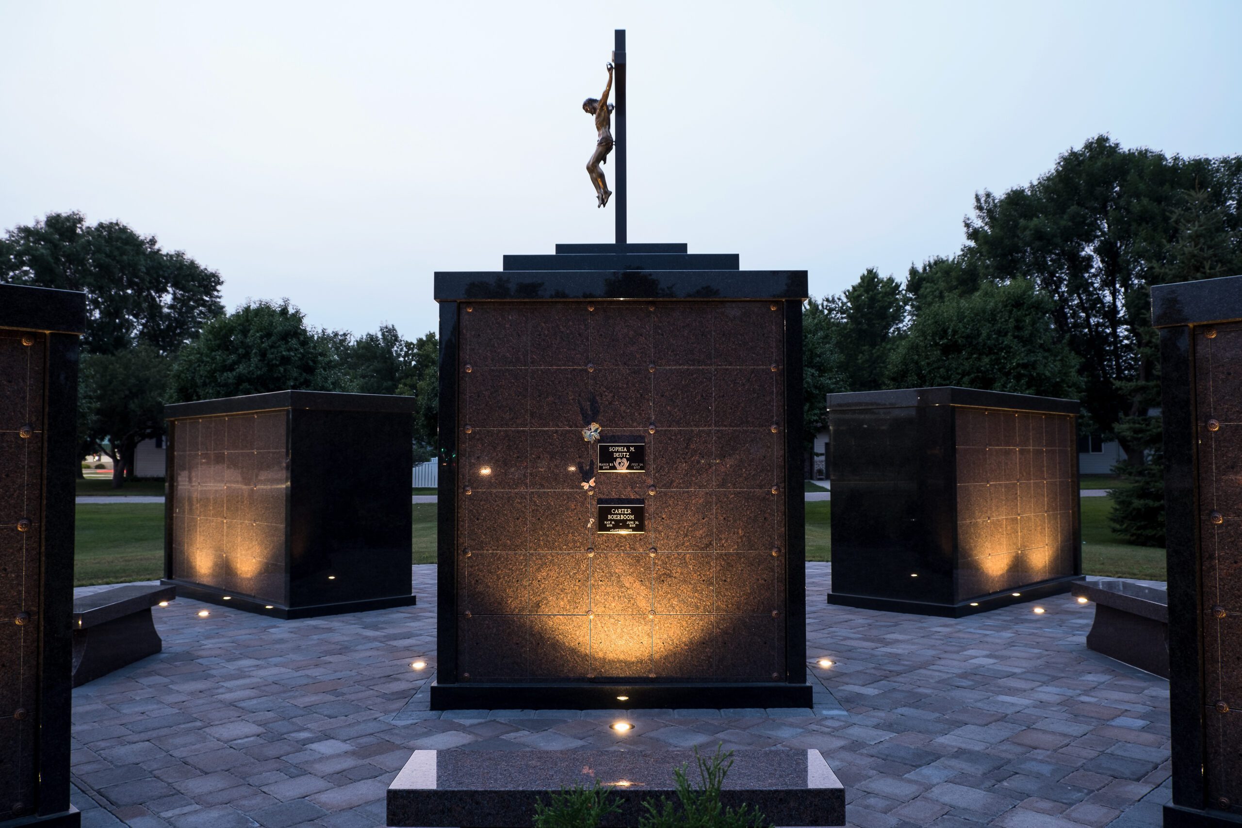 With little to no maintenance, granite withstands the elements and makes a lasting tribute for generations to come. For the new columbarium at Calvary Cemetery, Polished Carnelian® niche fronts with Mesabi Black® trim were the colors of choice. Each niche front is predrilled for a bronze plaque, a Coldspring provided option for personalizing the niche space. Loved ones can add items such as names, dates and emblems to the plaque. The columbarium design features five sections: a center unit with 156 niches, and four outer sections placed diagonally to each corner of the center unit. Each outer unit features 120 niches. Three granite benches in Carnelian encircle the columbarium’s perimeter and house additional cremation niches. Beautiful landscape lighting provides a dramatic nighttime effect. The design will allow for future expansion outside the existing sections, should the need or desire arise.
