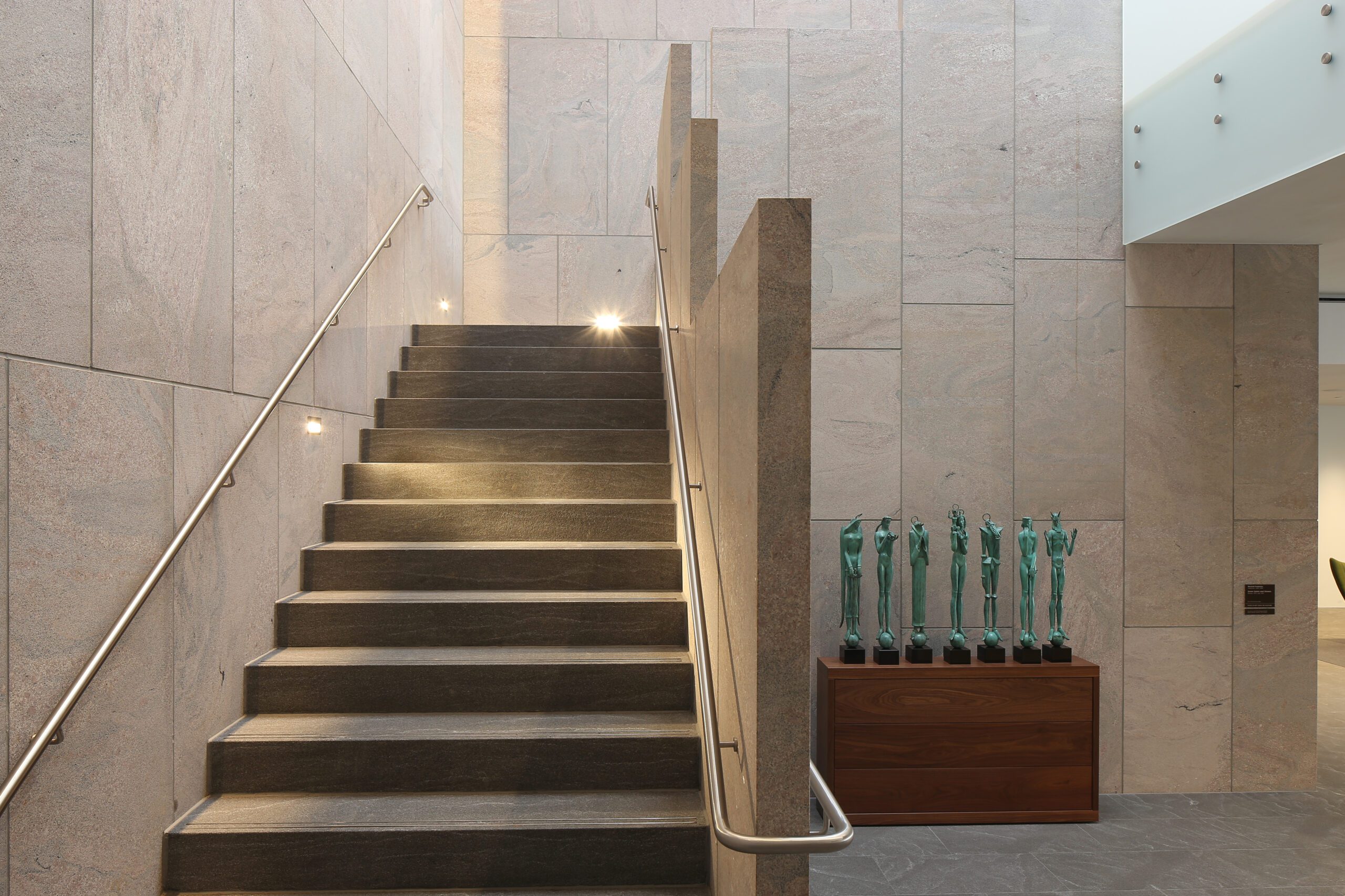 Requirements included a durable, cost-effective and timeless material that felt warm in tone and natural to its location. A stone with the visual appeal of life and movement was a must, as the architect wanted visitors to see a different building in the morning than in the afternoon. Echo Lake granite is a warm beige-colored granite with numerous sporadic, dark black markings and subtle accents of rose was the perfect choice to achieve the architect’s vision. Before the design team made the final decision on the granite selection, they visited Orr, Minn., which assured the team the Echo Lake quarry was a viable source for providing the large quantities required. During the quarry visit, the manufacturer provided a large-scale mockup to demonstrate the panels in various finishes, and Coldspring’s Diamond® 5 finish was selected for most of the project pieces – exterior and interior facing, roof coping, amphitheater benches, ramp and wall facing, and stair guardrails. Polish finish was selected for the Welcome Center’s information desk.